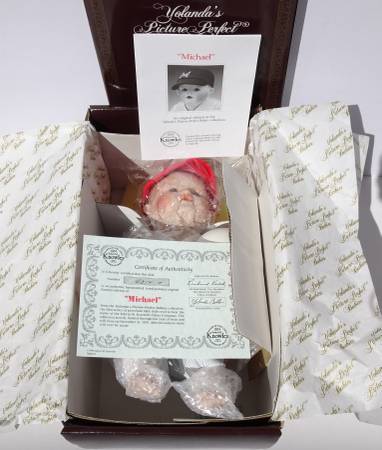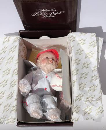 New in Box with all original packaging and contents, including paperwork, certificate of authenticity/ COA, cardboard Ashton Drake Galleries brand MICHAEL stamped box, brown Yolanda's Picture Perfect Babies inner box, original bubblewrap and plastic covering, and baseball.