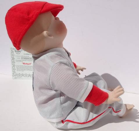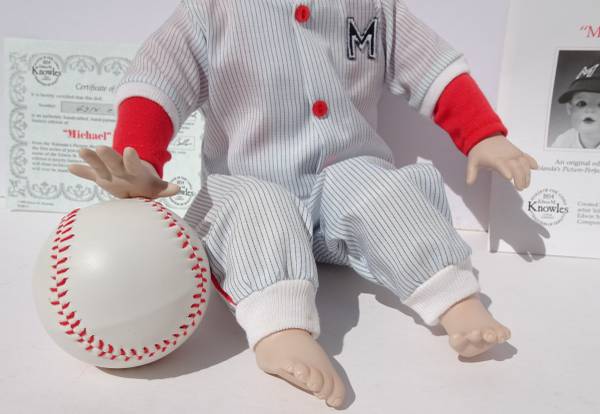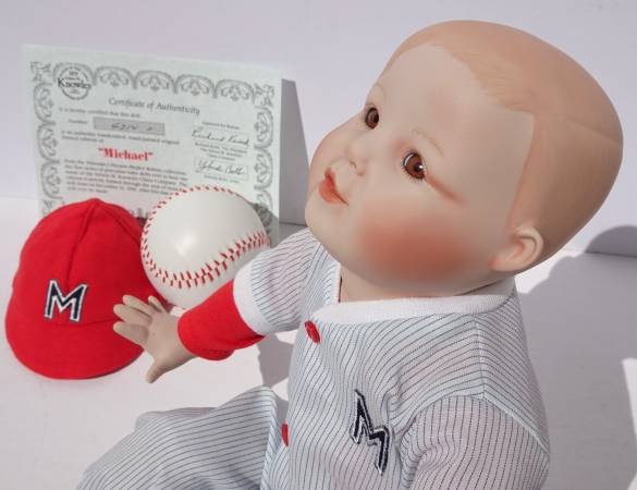 1990 Ashton Drake Galleries Porcelain Baby Doll “Michael” in Baseball Uniform. Collectible hand-crafted, hand painted Picture Perfect Baby Doll by Yolanda Bello. Baseball collector doll.