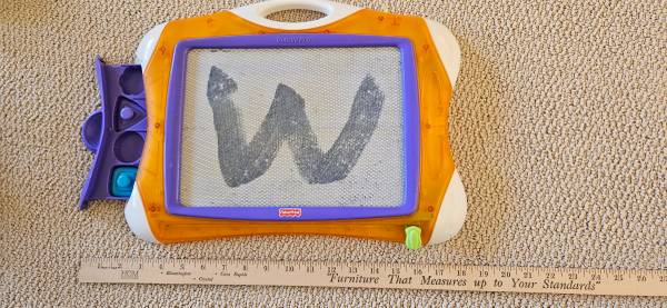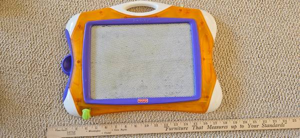The Fisher-Price Doodle Pro is a magnetic drawing toy for kids that features a mess-free screen and 2 shape stampers for creating art. It has an easy-slide eraser to clear the screen and a handle for portability. The toy helps children develop creativity, pre-writing skills, and fine motor skills. You would need a writing instrument with a magnetic tip. $6 Text or call show contact info