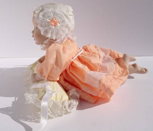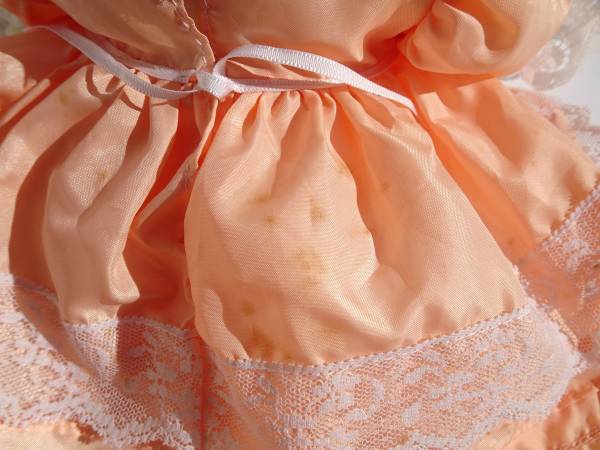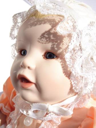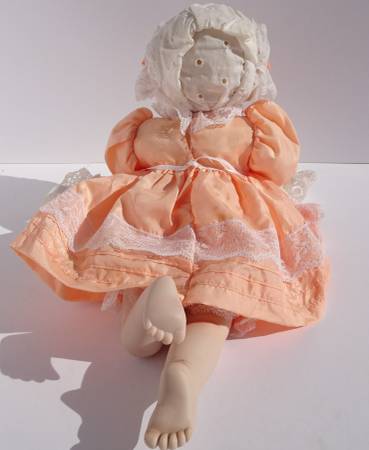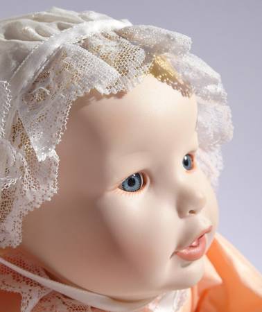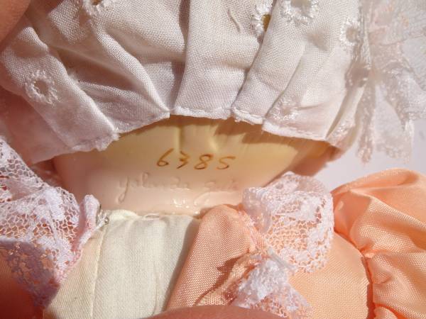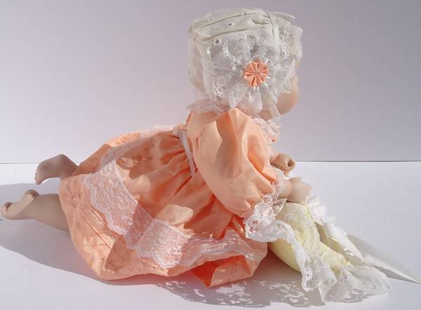 Handmade China baby doll on yellow pillow with bonnet and peach dress.