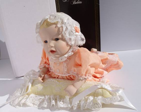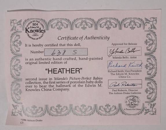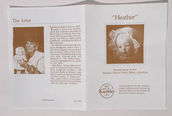 COA, cardboard Ashton Drake Galleries brand Heather stamped box, brown Yolanda's Picture Perfect Babies inner box, original bubblewrap and plastic covering, and pillow.