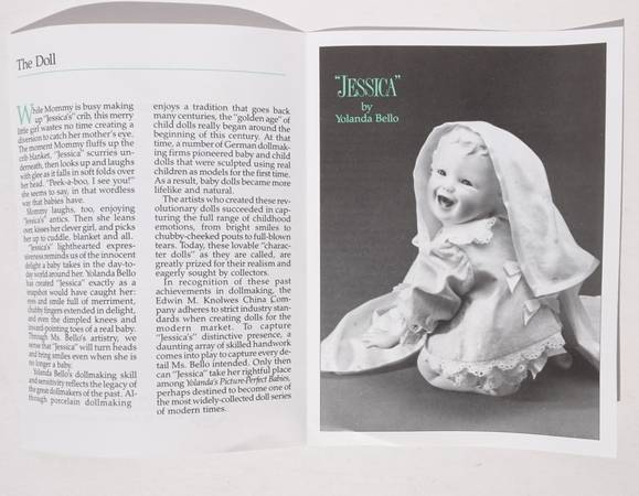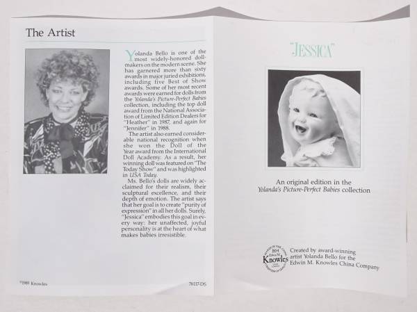 New in Box with all original packaging and contents, including paperwork, certificate of authenticity/ COA, cardboard Ashton Drake Galleries brand Jessica stamped box, brown Yolanda's Picture Perfect Babies inner box, original bubblewrap and plastic covering, and blanket.