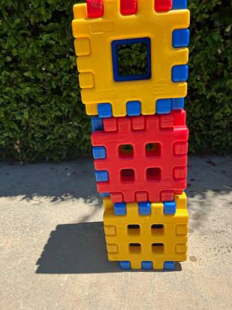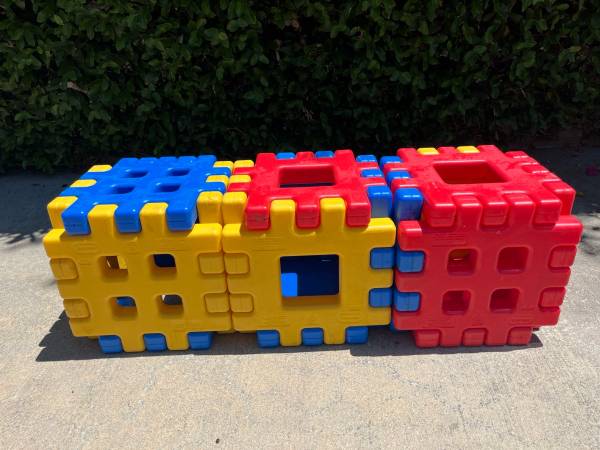 It has vibrant colors that are highly visible. This kid-friendly construction block set comes with 18 fun and colorful blocks, which are handy for building imaginations, for both indoor and outdoor play. - 18 piece building block set - Each piece is 14"L x 2"W x 14"H - Lightweight blocks fit easily together - Recommended for children ages 2 years and up