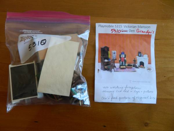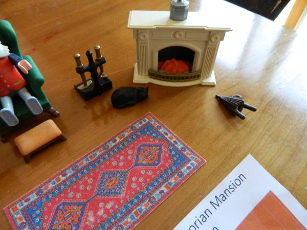 Playmobil 5310 Victorian Mansion Grandpa's Den Living Room for $30. Missing Cat Bed, Logs and Picture. If interested, text or email.