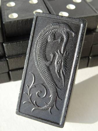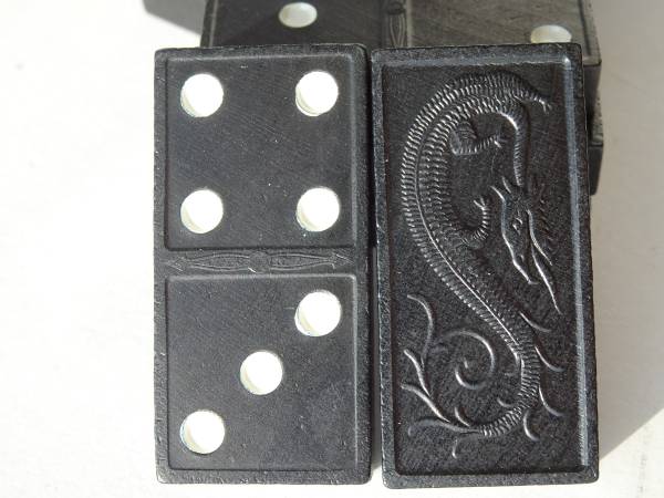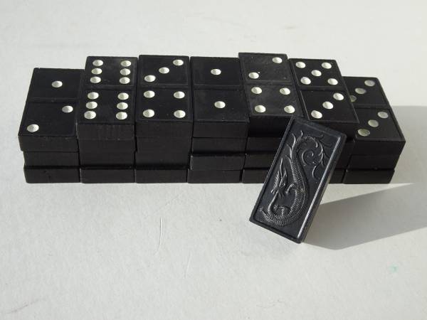 The black wooden dragon domino pieces are in great shape. However, one is missing - the blank/1 domino.