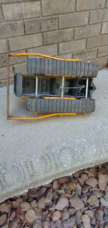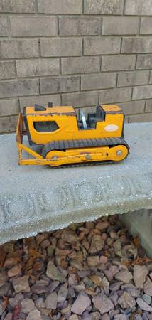 Vintage Tonka T-6 bulldozer, likely from the 1970s. It is a pressed steel toy with a movable front blade.