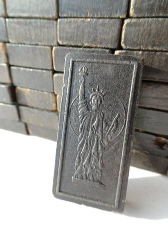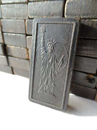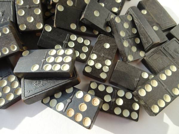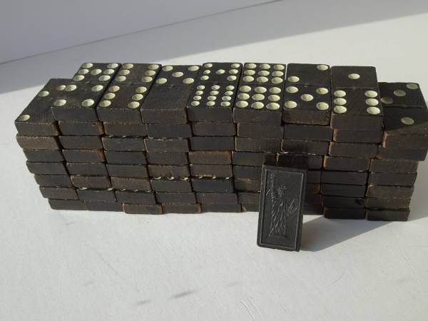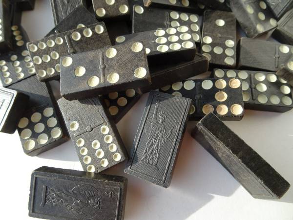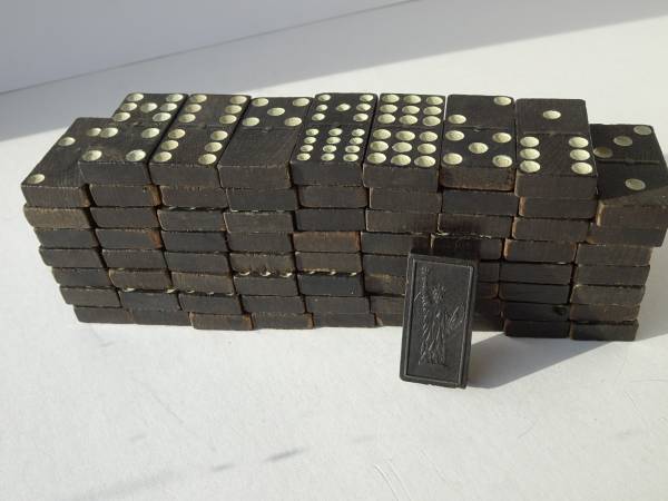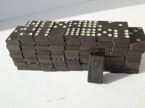 Vintage 1930's Statue of Liberty black wooden dominoes from The Embossing Company and made in the U.S.A.