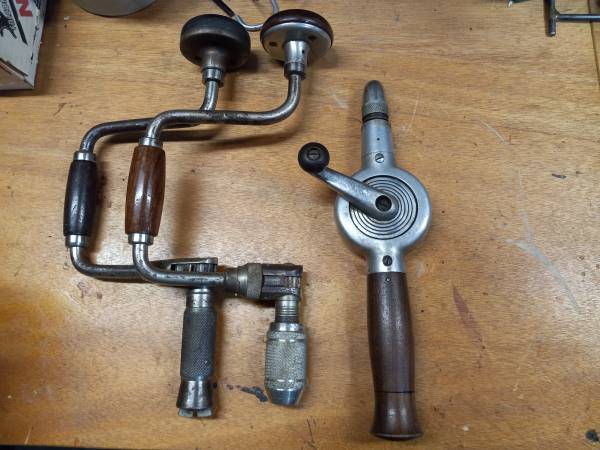 - Stanley #915 10". - Zenith 10". - Unknown manufacture. 12 1/2" total length. Has storage in Handle for standard wood bits. - 8 brace wood bits. 1/4" to 11/16". 7 1/2" to 8 1/2" long.