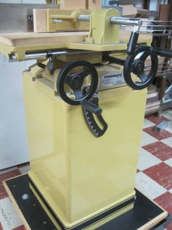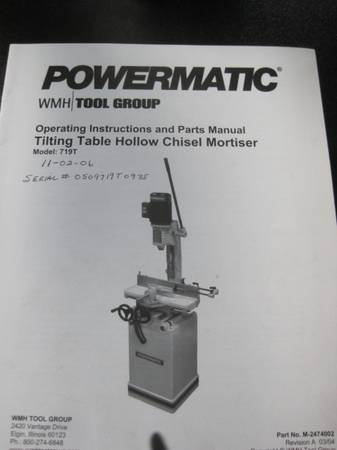 I have a Powermatic 719T chisel hole mortiser that I have built (2) 2" cherry/birdseye maple doors with this machine since I bought it new. I also made a mobil base that has black formica w/ a hardwood edge and is mounted to a HTC rolling base. There is a double set of start & stop jigs for repeated cuts, on the pipe fittings on the backside of the mortiser..I also have (2) sets of CMT chisel mortise bits in the following sizes: 1/4", 5/16", 3/8" 1/2", 5/8", 3/4" the only bit that has never been used is the 3/4" bit which is in the machine just for presentation that bit will be included in the group for $200.00 I will sell those for $200.00. This entire group is like BRAND NEW. Call Tux @ 651 7zero7 6920 Thanks