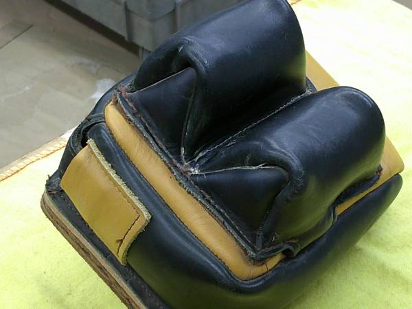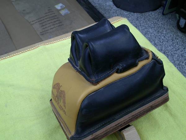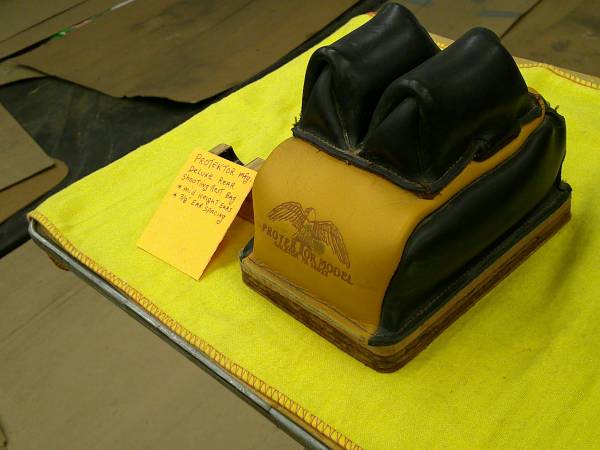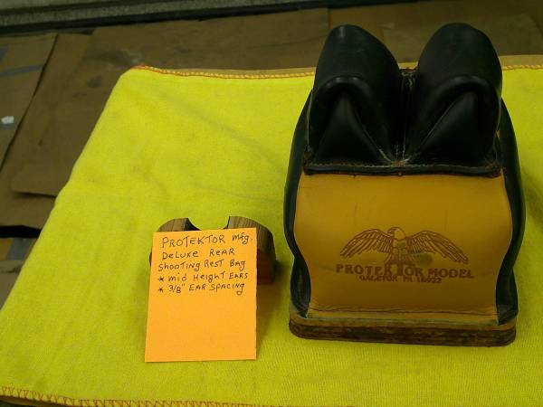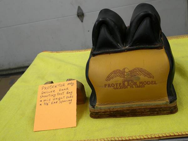 Protektor Deluxe Model - Mid Ear Height - Rear Rifle Rest Bag. This bag has a bottom comprised of 3 layers of stiff leather with an integral doughnut that eliminates any rocking movement. The sidewalls have stiffer leather than similar bags. This prevents "rounding" of the bag over time. This is a "Mid-Ear" model that has slightly taller and wider ears than a traditional "Bunny Ear" bag. This bag easily accommodates larger stocks. It measures 6 3/4" long x 5" wide x 5 1/2" high with 3/8" spacing in between the base of the ears. It is in excellent condition featuring all leather construction and is filled with "heavy" sand. Total weight is 10#. Cash only. Please call John at show contact info