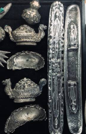We love curved silver bars and figurines, old silver dollars and coins, and ceremonial jewelry like Spirit Lock Necklaces.