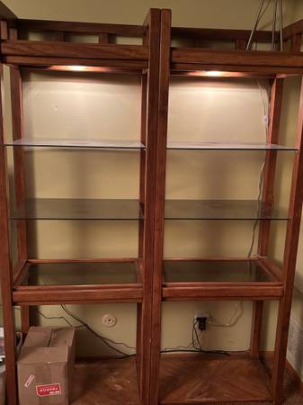 Set of two lighted wood and glass shelves. 70” x 52” x 16” when set side by side. We have enjoyed them for many years but are downsizing in preparation for moving to a smaller place. There is some water damage to the ground level shelves, but the upper glass shelves and frame are good.