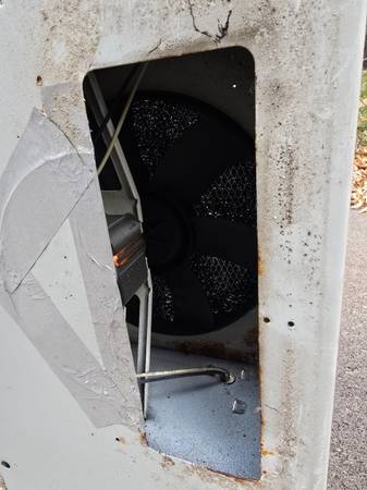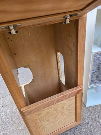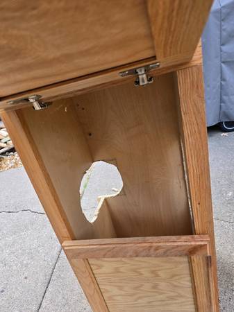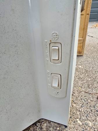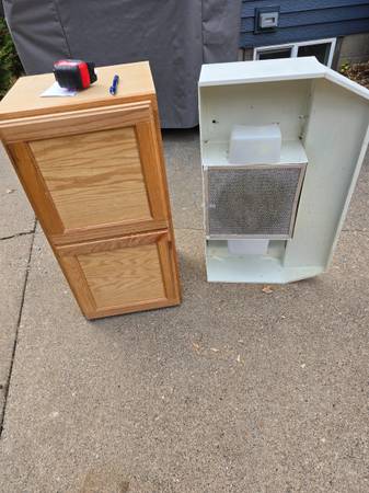 Please take both. On the curb. Nutone range hood with two fan speeds and two lights. 30" wide x 17 3/4" deep x 6" high. Works well. Cabinet for above the hood: 30" wide x 13" deep (including doors....