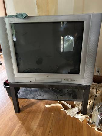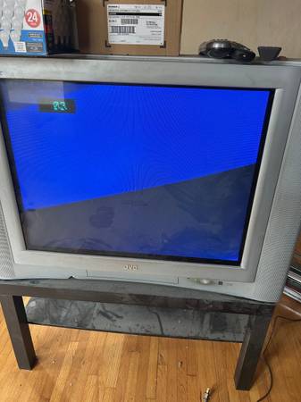 Older style TV Blue screen when TV is turned on. No cable to connect to, so not sure if TV works. Remote controls included