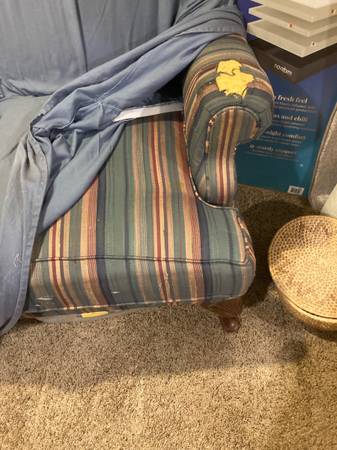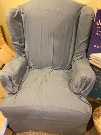Very comfortable wing chair, with slipcover, and ottoman. Take one or both. Chair would be good for basement or dorm, could also be an upholstery project