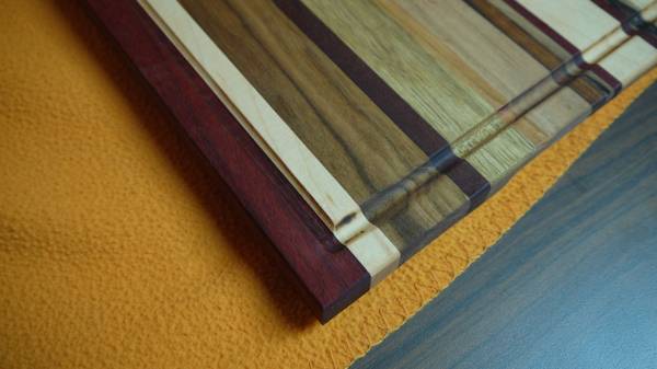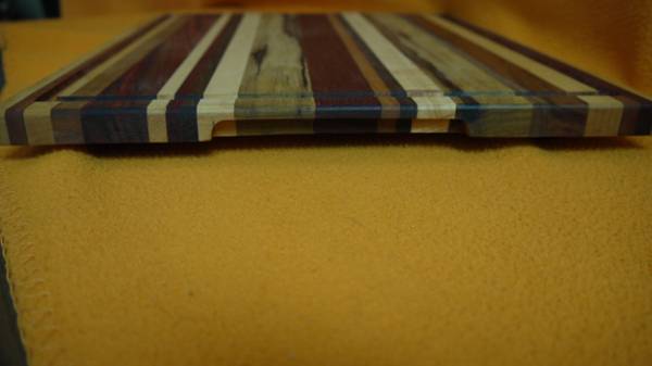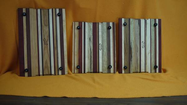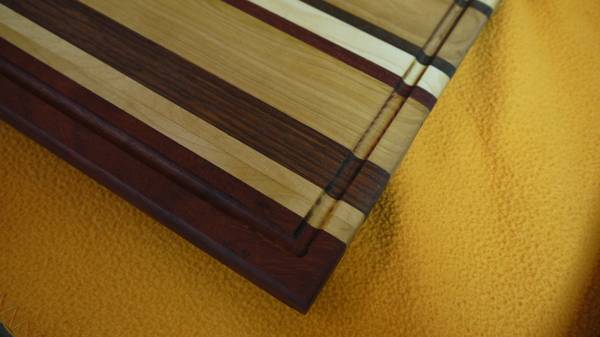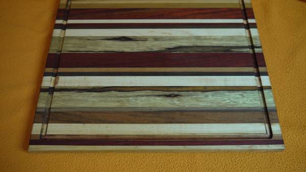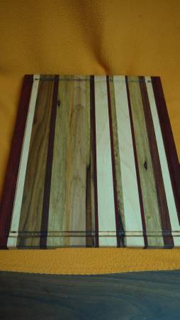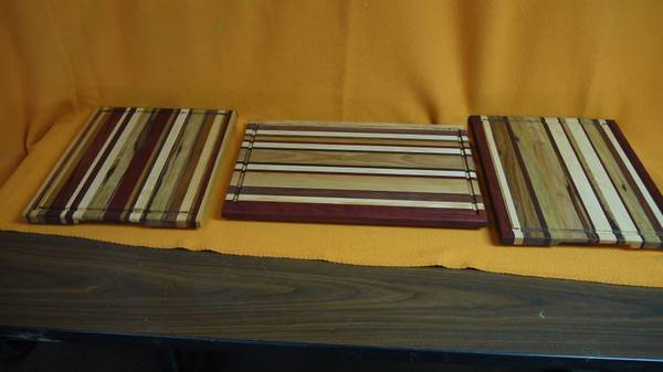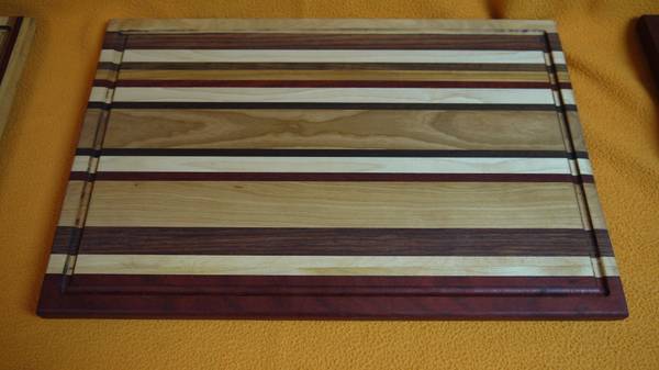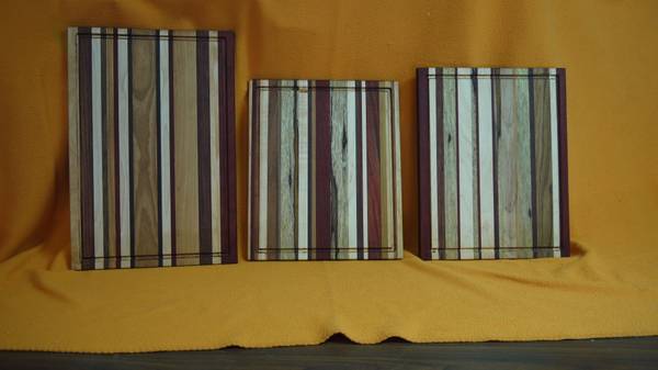 I have these 3 solid exotic wood cutting boards the I just finished creating and now have up for sale. They have the latest colors that will brighten up your Kitchen decor as they bring another very functional piece to your work space. My wife uses hers daily preparing our meals and leaves it out for everyone to see. These boards are all 12.5" wide and vary in length from 15+" to 18+". The 2 small ones: one is 15" and the other runs 15.5" The larger one run a bit over 18". I try to make these different sizes as everyones available space is different in the Kitchen. All of them are 7/8" thick, have a juice trough installed around the entire perimeter, have cut in handles on each end to carry it wherever you need it to go and have solid rubber feet installed to prevent them from sliding around while cutting. You can also use it as a serving tray for snacks as such! So with things the way they are now in the world everyone is spending more time at home, so bring some fun to your prepping meals with one of these. They have been hand crafted here in my shop Hugo with great precision and attention to details. All have been coated multiple times with cutting board oil and are ready to go work for you right away.. Easy to maintain and fun to own. Come check them out! 2 smaller ones go for $50 each while the larger one runs $60!