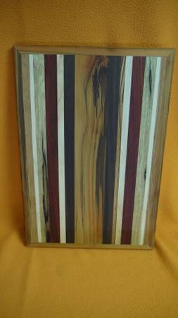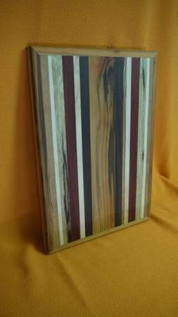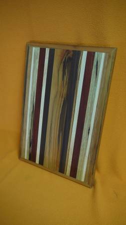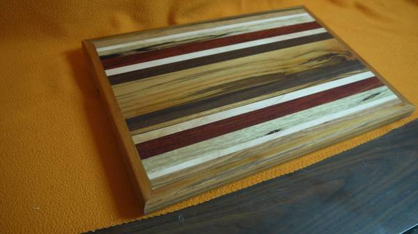 This is one solid wooden cutting board that is all of 1.25" thick, sleek, beautiful colors that are bright and light. Measuring 20" long, 14" wide this will not only become a great cutting board for everyday use but will also bring great color to you Kitchen. The exotic wood strips are glued together, encompassed with a solid 1" piece of wood also glued and the whole unit has been glued onto a 1/2" piece of solid ash to create a very durable bottom. Handles have been cut into each side for easy transport if using as a serving tray and solid rubber feet have been installed on the bottom to keep it from sliding around while cutting up this veggies. So have some fun when entertaining or simply enjoy using this for daily cutting chores. The top has multiple coats of food safe cutting board oil while the bottom has been protected by a few coats of poly to keep it looking great! A steal at only $70. Makes a great gift for any occasion!