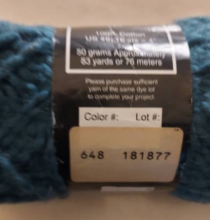 One small skein blue green yarn Color 648 and lot #181877 100% cotton Approximately 83 yards. From smoke free home.