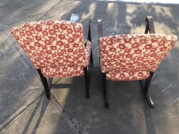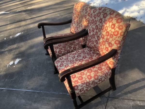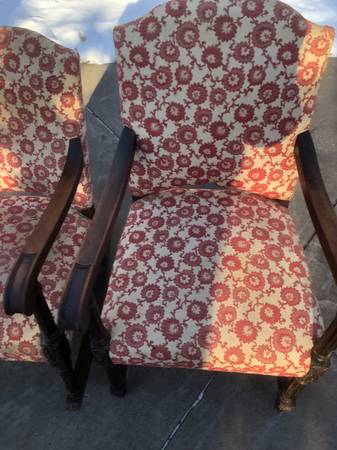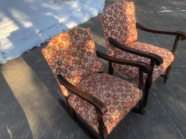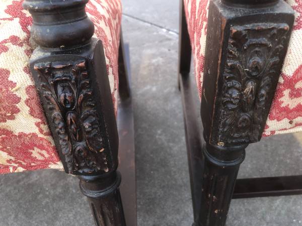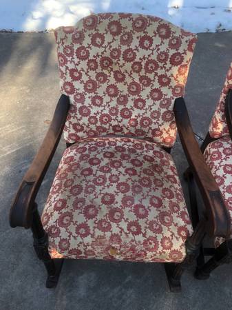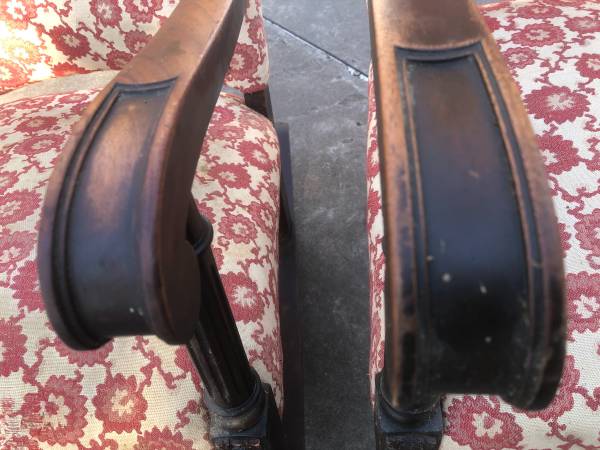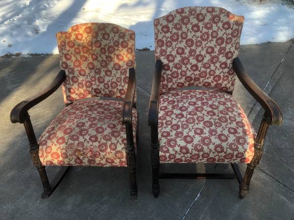 Antique upholstered rocker and side chair with carved legs. Need to be reupholstered.