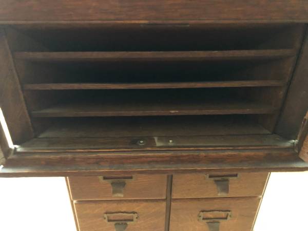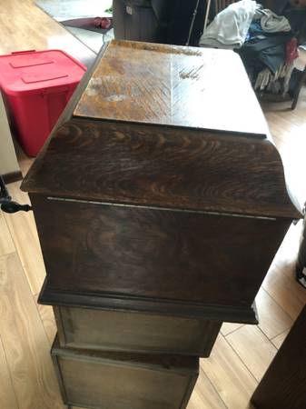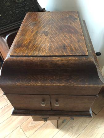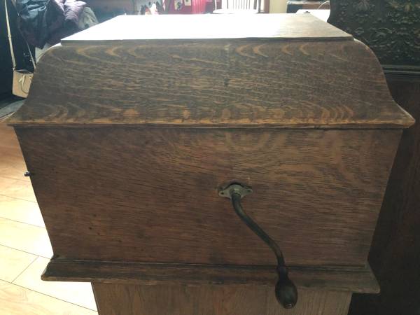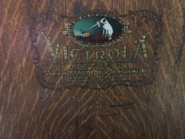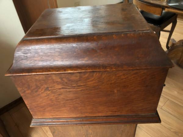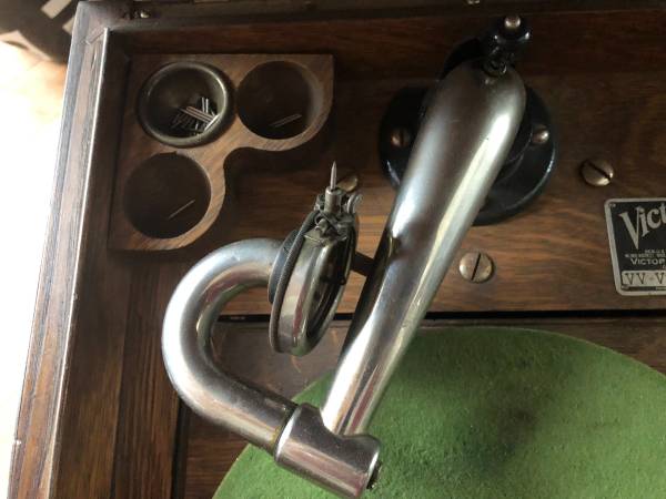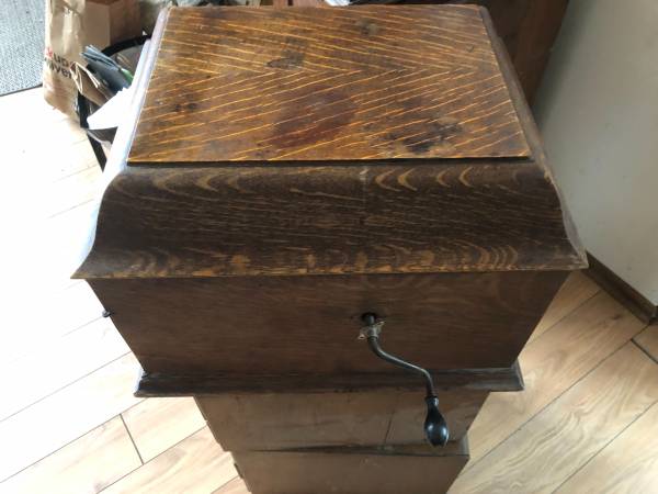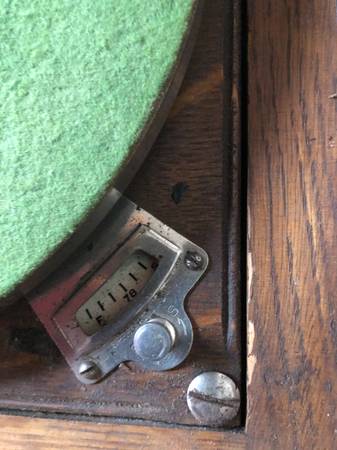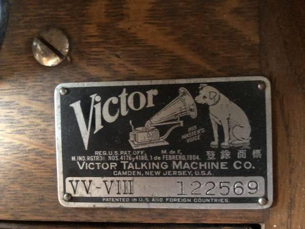 Antique oak table top Victor Talking Machine VV - III in working condition. Minor stains on top.