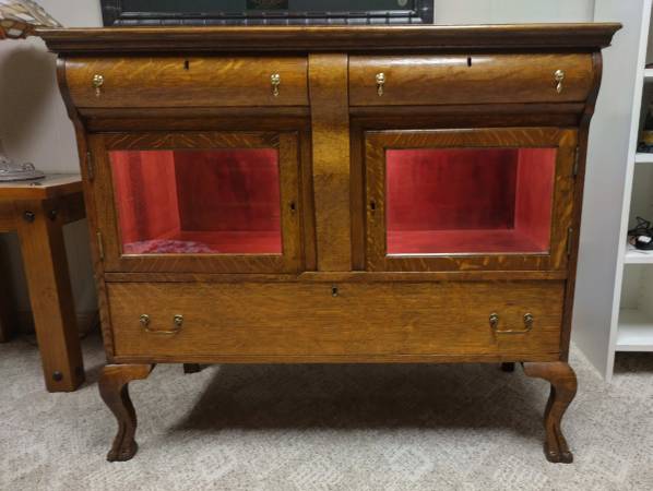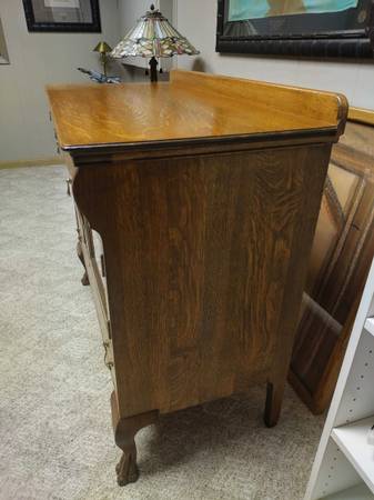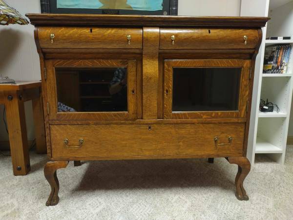 Antique Oak Hutch framed glass doors with interior light.