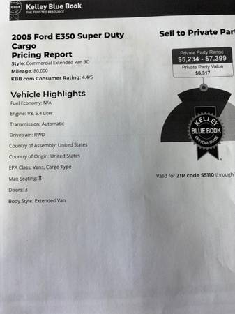 I am selling 2005 Ford E-350 Cargo Van. 6.8l V10 that runs and drives great. Over $2000 in new tires and brakes and only 80,000 miles on it. Ready for work. $6,250/BO Local and cash only Thanks Alex