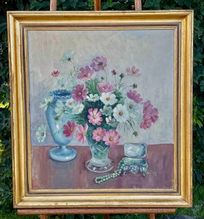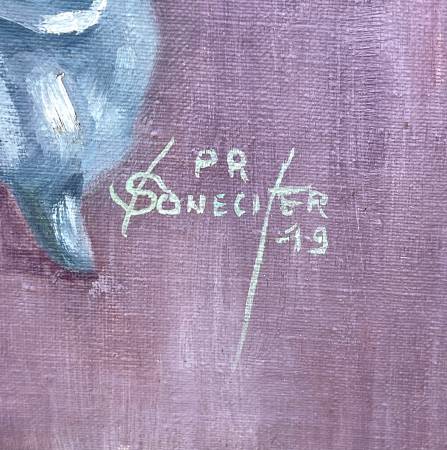 A lively, fresh looking still-life painting from 75 years ago: oil on heavy board; signed and dated, P R Soneciler, 1949; 24” by 26” frame, 22” by 24” painting; $165 Bob Home decor, antiques