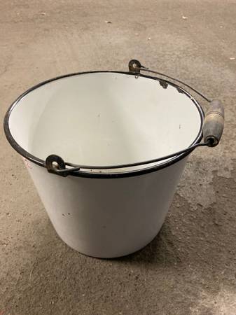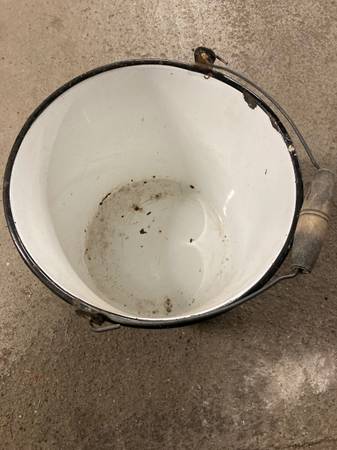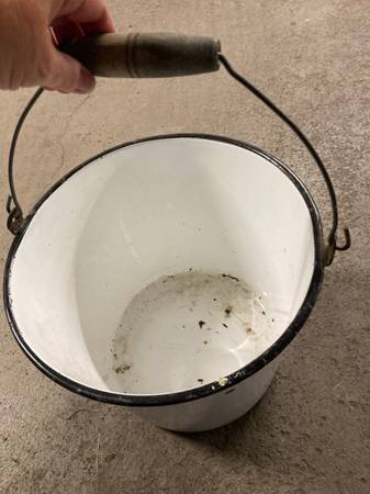 Large vintage black and white enamelware bucket with wooden handle. In good used condition. Cash only. Pick up in Stillwater.