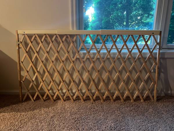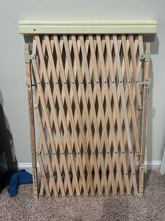 Extends out to 56” maximum. Has hooks on either end but does not come with the wall hook attachments. I’ve found you can use eye hooks or take the attachment off altogether. Up to you.