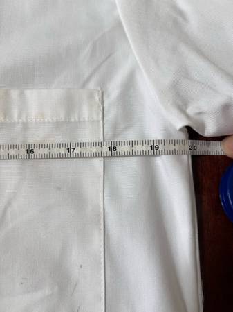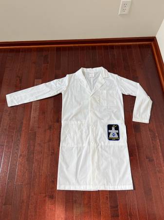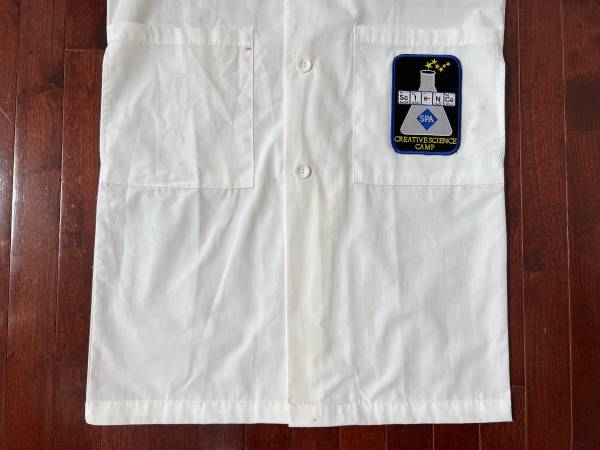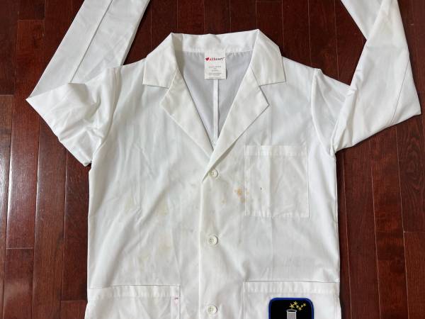Condition: excellent, used one week for a science summer camp. Stains included. You can wash it but it looks more authentic and has a nice starched press.