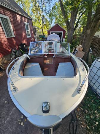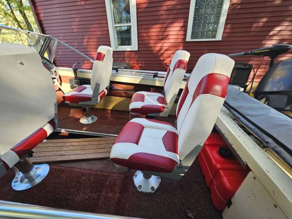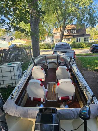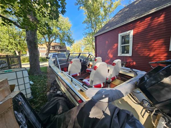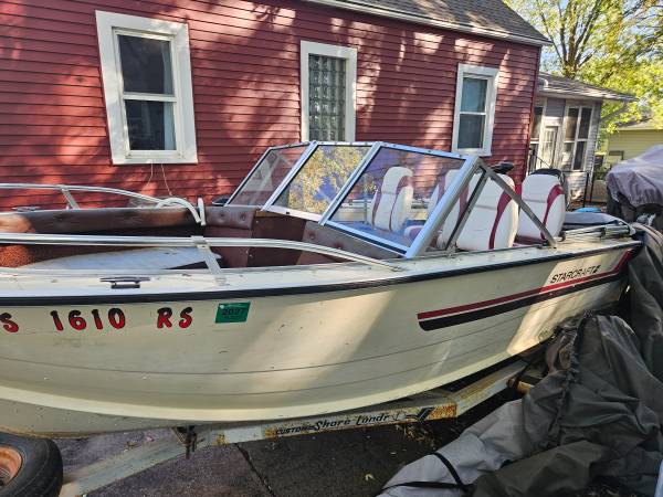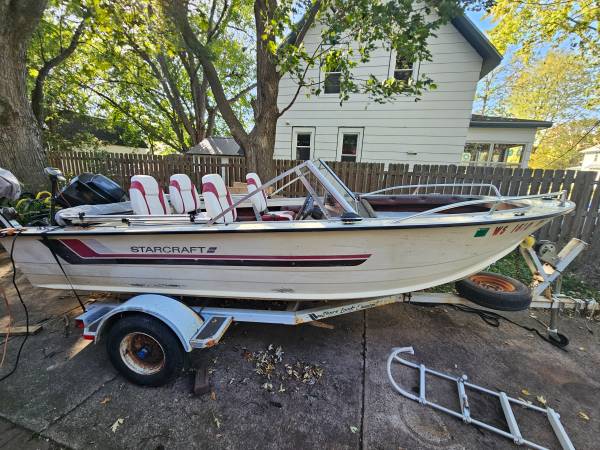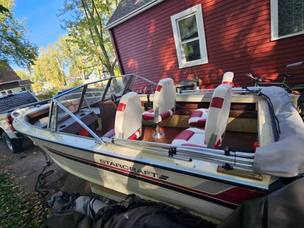 1983 16.5 foot Starcraft SuperSport 160 with 40 HP 1990 Mrecury two stroke with remote trim and tilt. Motor has a new prop and the older one as a spare. The motor cowling is slated to be repainted straight black without decals. Once this is completed I will add the updated photos. The boat is winterized and cleaned for storage. It has an oversized portable 9 gallon fuel tank. In deck Ski/Fishing Pole storage. 40lbs thrust 12 volt transom mount trolling motor. The boat is a deep V and the interior side depth is 24" which is great if you have younger children. The boat doesn't leak as I had it docked during a week without rain and had no water drain when I removed it from the lake. The bilge pump does work as there was rain on a different vacation where it was docked. A new canopy was installed last year and is high enough for someone 6'2" to stand under. With the current set up and roughly 650lbs in person and gear the boat will top out at 27mph (clocked by phone gps). The boat still has all of the snaps for a custom canvas cover but will come with an tension strap cover (has rips but can be repaired).