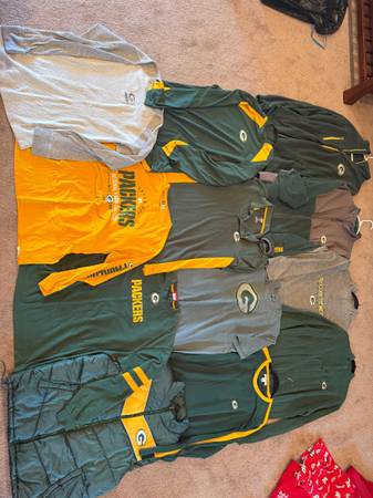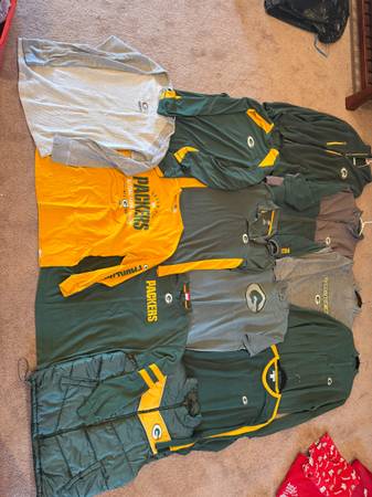 Green Bay Packer long and short sleeve shirts / Sweaters, etc all roughly Xl and some large Two Green Bay Packers coats both in great condition both men’s extra large and in mint condition