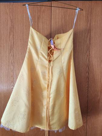Lemon yellow dress "pops" with sparkles. Sleeveless, size 9. Worn once, professionally cleaned. Knee length. Looks well with black or white short sweater or stole. No smoking, no pets household....
