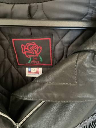 Vintage (90’s) open road,black leather motorcycle jacket. Short waist jacket with fringe accents. Zip closure and snap side pockets. Silver hardware. Nylon lining provides warmth and comfort.