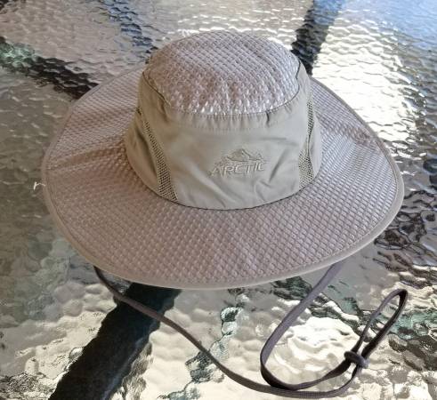 I am selling a new (never used) beige, wide-brim, sun hat with chin-strap, crown cinch strap, and cooling technology. Price is $10.