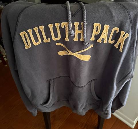 Dk. Gray Duluth Pack hoodie with crossed paddles and front pocket. Excellent used condition- very soft and cozy. These retail for $85. Cash only. Pick up in Stillwater.