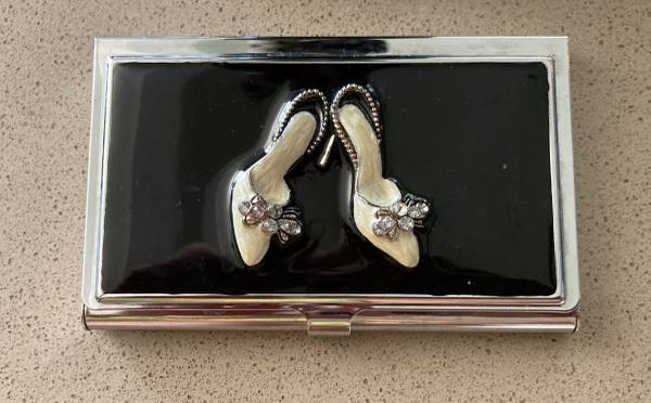 Black and very shiny stainless steel card holder with high heel shoe design. Excellent used condition. Clasp works well. Cash only. Pick up in Stillwater.