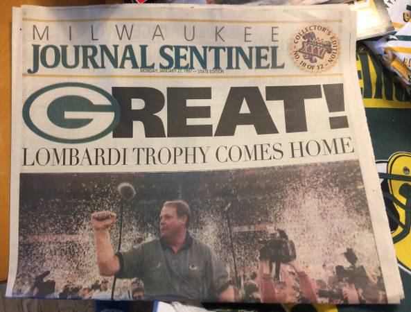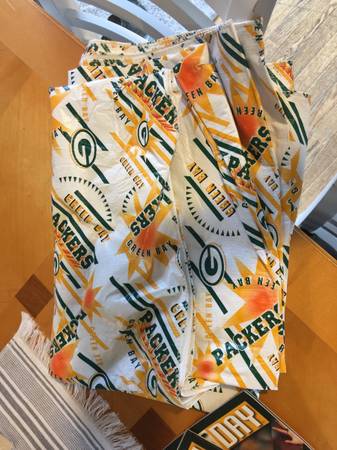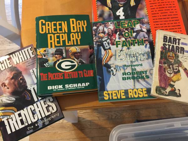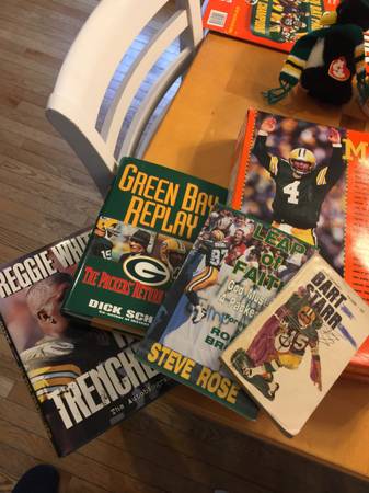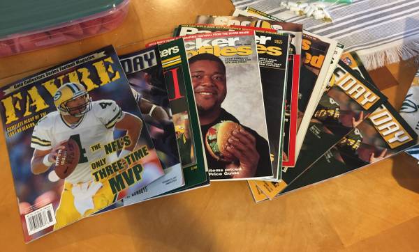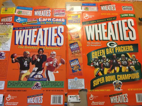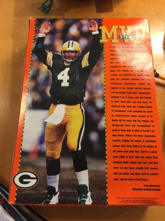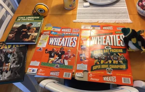 Variety of Green Bay Packers memorabilia including an unopened Wheatie’s box with Brett Favre on the cover.