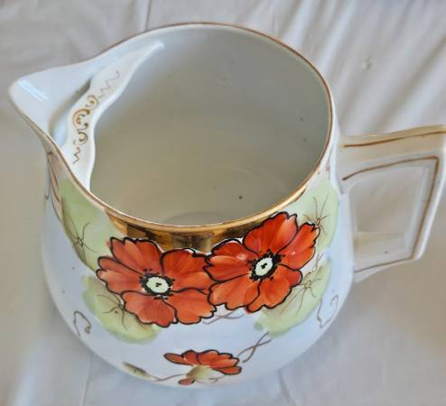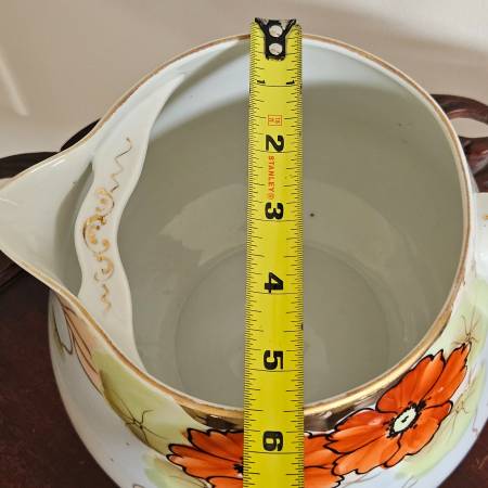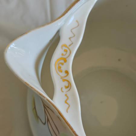 The stamp on the bottom of the pitcher is E-OH China Hand Painted Nippon. The stamp dates the set as antique with the items being created between 1891-1921. There are no chips, cracks or crazing....