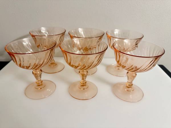 For sale is this set of 6 Arcoroc rosaline pink swirl sherbet glasses. These were made in France and are clearly marked on the bottom of each glass. All of the glasses are in perfect condition with no damage to mention. They each measure approximately 5.5 inches tall by 3.75 inches wide.