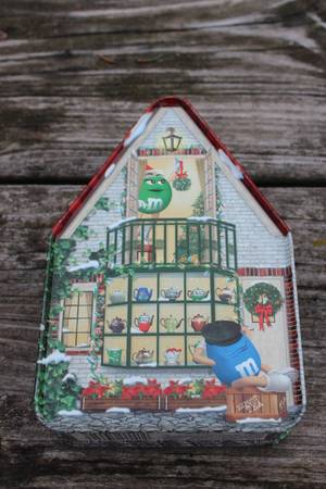 M&M's brand Tea House, Number 15, Limited Edition Canister 2002. Great collectible M&M tin, featuring a holiday tea house! Tin would be great to display or store your favorite items, or use it for a gift filled with treats. Tin measures just over 5" wide, 7.5" tall and ~2-1/4" deep.