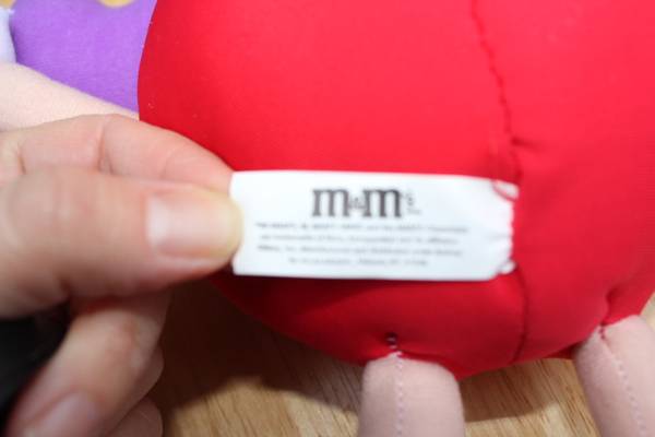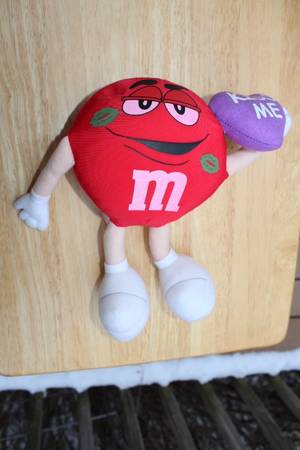 Just in time for Valentine's Day! Red M&M plush is holding a purple heart that says "Kiss Me". Figurine measures ~9.5" tall x ~10" wide x ~3.25" deep. From a smoke-free home.