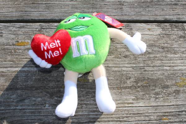 Cute figurine is of the green M&M holding a heart with a heart that states "Melt me!". Figurine has posable arms and legs. Measures 7.5" tall and 8" wide (depending on arms posed). From a smoke-free home.