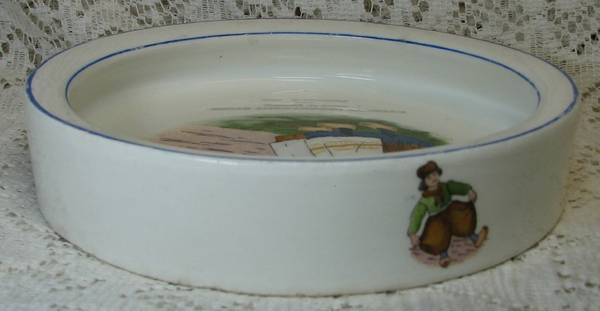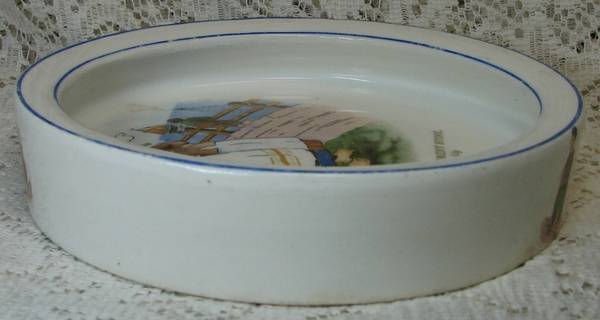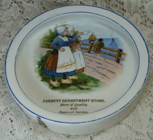 I have for sale a heavy vintage porcelain baby feeding dish advertising Everett Department Store with a beautiful Dutch seaside scene in the middle and on the outside. It probably dates back to the 1950's or before. It is not marked with a manufacturer but I have seen other dishes with scenes by the same artist marked Homer Laughlin. The dish is in very good condition with no chips, cracks or obvious wear. It displays very nicely. It is about 7” across and 1 ½” tall and weighs around 1 1/2 lbs.
