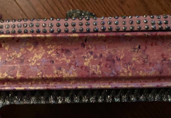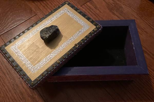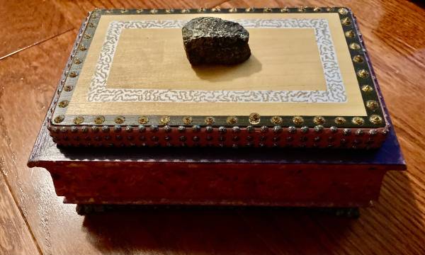 Intricately designed, sparkly and unique, handmade wooden box with a decorative pyrite stone on top. Measures approximately 7.25x4.25 inches. Excellent condition. Signed Goldy Lynx ‘98. Cash only....