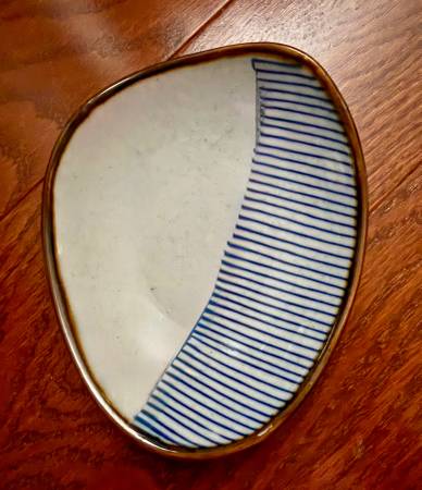 Unique small, oval, half stripe dish with brown rim from Hasami Town in Nagasaki Prefecture, Japan. This ceramic manufacturer has a history spanning approximately 400 years.