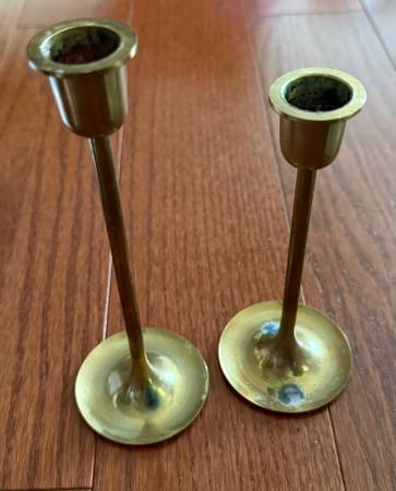 Set of 2 brass candle holders, MCM style, Made in Taiwan. They are in good used condition. Measure 7 and 6 inches tall. Cash only. Pick up in Stillwater.