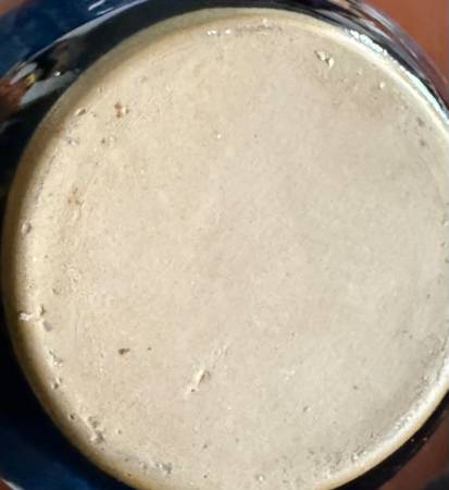 This vase is reminiscent of a vintage West German piece from the mid-20th century, It has a round shape with a narrow opening. Deep blue speckled glaze with a possible "spritzdekor" or "hare's fur" effect.
