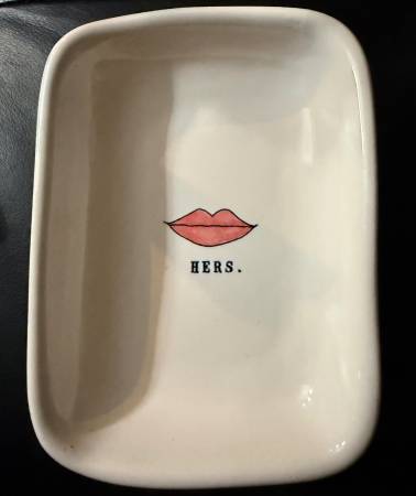 Rectangular ceramic tray with 'HERS' and lips design. In like-new condition. Measures approximately 5x3.5. Cash only. Pick up in Stillwater.