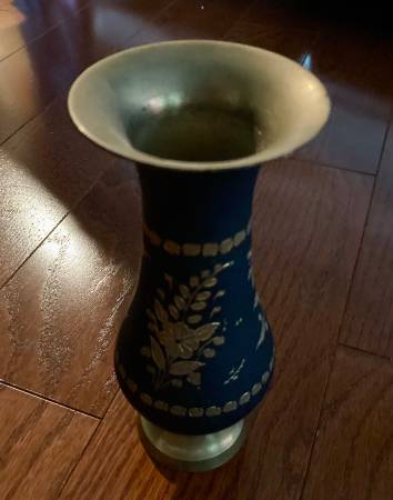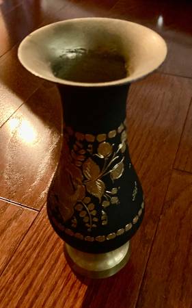 Black and gold decorative brass vase with floral design. Excellent vintage condition. Measures 7.5 inches tall, base is 2.25 inches. Cash only. Pick up in Stillwater.